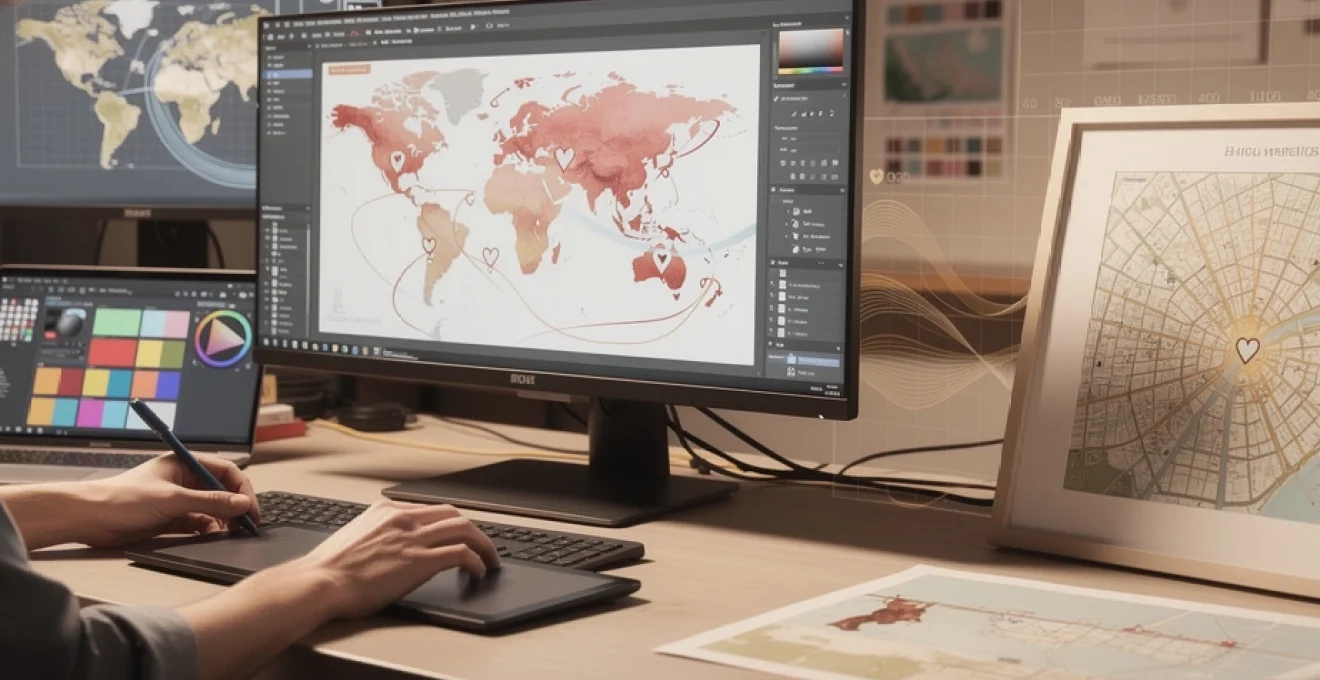 Lorsque l’objectif final est une affiche imprimée sur un beau papier d’art, Adobe Illustrator reste un outil de prédilection. Capable d’ouvrir des fichiers SVG ou d’importer des exports vectoriels issus de Mapbox, QGIS ou d’autres solutions, le logiciel permet un contrôle extrêmement fin sur chaque détail graphique. C’est dans Illustrator que vous pourrez peaufiner la typographie, ajuster au pixel près la position d’un cœur ou d’une icône, ou encore harmoniser les couleurs avec la teinte dominante de la pièce où sera accrochée la carte.